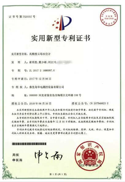 公司于2017年12月6日提交的“高精度云母水位計(jì)”(專利號(hào):ZL 201721680097.0)專利已被中華人民共和國國家知識(shí)產(chǎn)權(quán)局頒發(fā)專利證書,授權(quán)公告日為2018年6月26日,授權(quán)公告號(hào):CN 207540623 U。