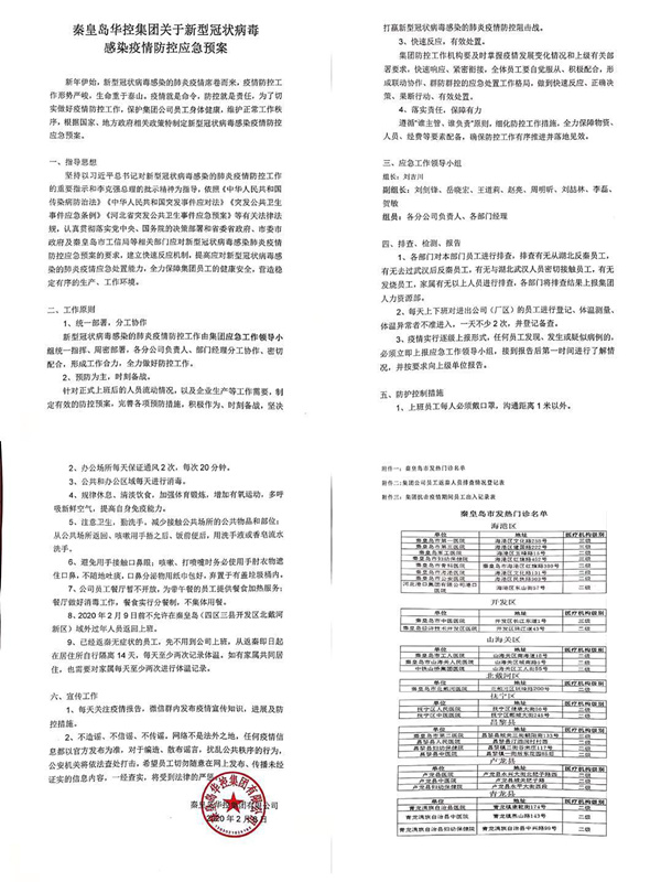 2月8日,在黨和國家領(lǐng)導(dǎo)人的親切關(guān)懷下,依照《中華人民共和國傳染病防治法》《中華人民共和國突發(fā)事件應(yīng)對法》《突發(fā)公共衛(wèi)生事件應(yīng)急條例》《河北省突發(fā)公共衛(wèi)生事件應(yīng)急預(yù)案》等有關(guān)法律法規(guī),秦皇島華控集團有限公司認(rèn)真貫徹落實黨中央、國務(wù)院的決策部署和省委省政府、市委市政府、區(qū)委區(qū)政府、市工信局以及臨港物流園區(qū)等相關(guān)部門應(yīng)對新型冠狀病毒感染肺炎疫情的部署,在集團內(nèi)部編撰并下發(fā)了“秦皇島華控集團關(guān)于新型冠狀病毒感染疫情防控應(yīng)急預(yù)案”,建立快速反應(yīng)機制――成立了以董事長劉吉川為組長,集團公司領(lǐng)導(dǎo)班子成員為副組長,各分公司負(fù)責(zé)人、部門負(fù)責(zé)人為組員的“應(yīng)急工作領(lǐng)導(dǎo)小組”,提高應(yīng)對新型冠狀病毒感染的肺炎疫情應(yīng)急處置能力,全力保障集團員工的健康安全,營造穩(wěn)定有序的生產(chǎn)、工作環(huán)境。