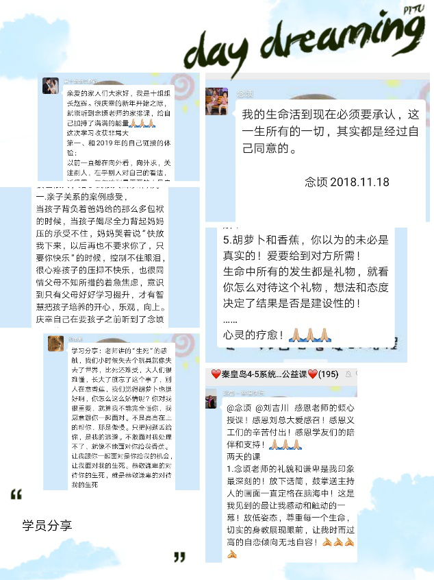 課程結(jié)束后看到大家都在群里分享自己的感想與收獲,讓我想起開課前臨時(shí)邀請(qǐng)擔(dān)任主持人,當(dāng)時(shí)的心情特別矛盾。有興奮,第一次上臺(tái)當(dāng)主持對(duì)自己是個(gè)很大的挑戰(zhàn);有心虛,非常不自信覺得自己做不好;有糾結(jié),因?yàn)楹⒆舆€有兩天時(shí)間就期末考試。最后我還是決定抓住機(jī)會(huì),做自己想做的,相信越努力越幸運(yùn),于是我就這樣在沒有任何準(zhǔn)備的情況下做了兩天的主持人。