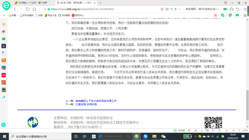春節(jié)前夕,突如其來的疫情影響了整個中國,在這場戰(zhàn)“疫”面前,人人有責,華控集團作為一家負責任、有擔當?shù)拿駹I企業(yè),積極貢獻了自己的力量!關(guān)于華控集團《戰(zhàn)“疫”為國,保民安康》的通訊報道在中國機電一體化技術(shù)應(yīng)用協(xié)會工程技術(shù)發(fā)展中心網(wǎng)站刊登,對我公司在此次戰(zhàn)役做的貢獻進行了肯定。大災(zāi)面前,應(yīng)有大愛,這場戰(zhàn)役面前,人人有責。但要怎么做、如何做,離不開一個積極向上公司正向的引導(dǎo),在這里我想華控集團給我們做了一個很好的榜樣,讓我們知道了什么是責任、什么是擔當、什么是大愛。