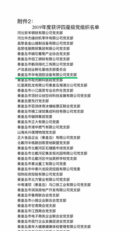 2020年,中共秦皇島華電測(cè)控設(shè)備有限公司支部委員會(huì)通過自下而上的方式申報(bào)至上級(jí)街道黨工委,上級(jí)黨工委指派專人到基層組織進(jìn)行測(cè)評(píng)、考評(píng),經(jīng)黨委會(huì)議評(píng)定并公示后確定評(píng)星等級(jí),授星,我公司支部委員會(huì)被評(píng)定為四星級(jí)黨組織。