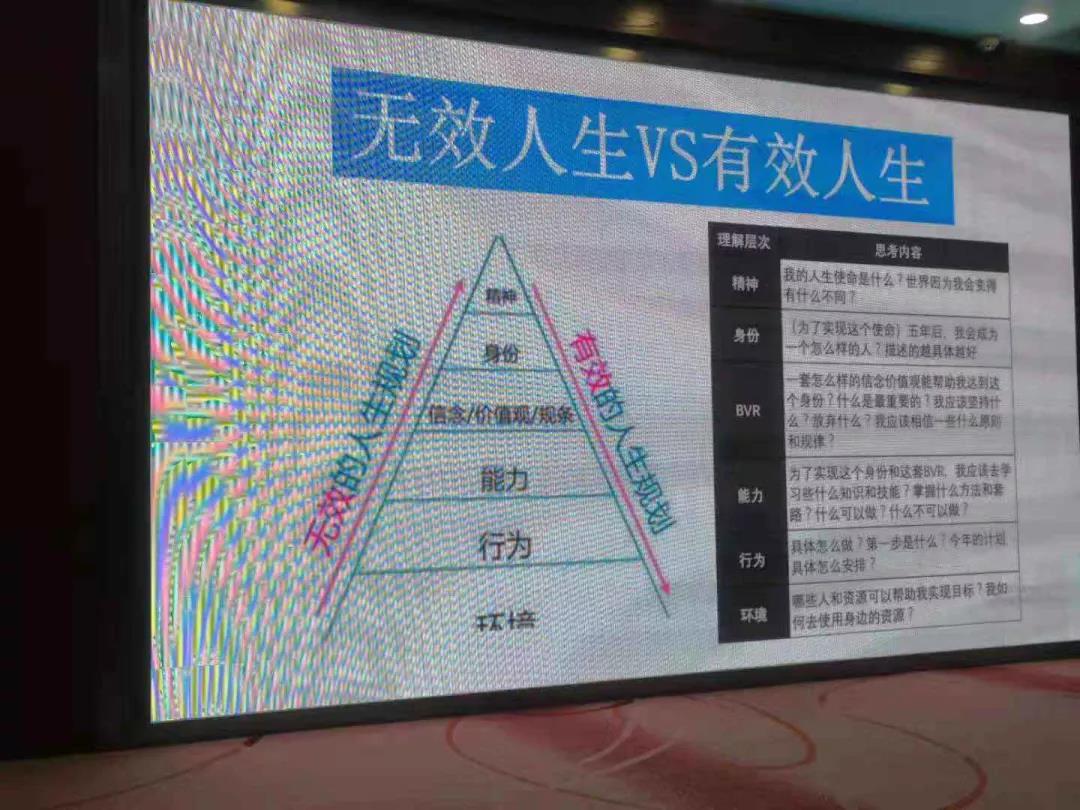 首先,劉老師將“有效人生”和”無(wú)效人生”進(jìn)行了對(duì)比。隨后,劉老師就“精神、身份、信念、能力、行為、環(huán)境”等幾個(gè)方面提出了問(wèn)題,引導(dǎo)我們思考。