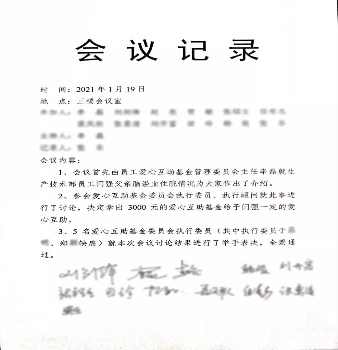 1月19日,當(dāng)公司領(lǐng)導(dǎo)得知生產(chǎn)技術(shù)部員工閆強(qiáng)父親因腦溢血而住院的情況后,組織召開(kāi)了員工愛(ài)心互助基金會(huì)議,會(huì)上經(jīng)過(guò)集體討論,基金決定拿出3000元款項(xiàng)給予一定的愛(ài)心互助。