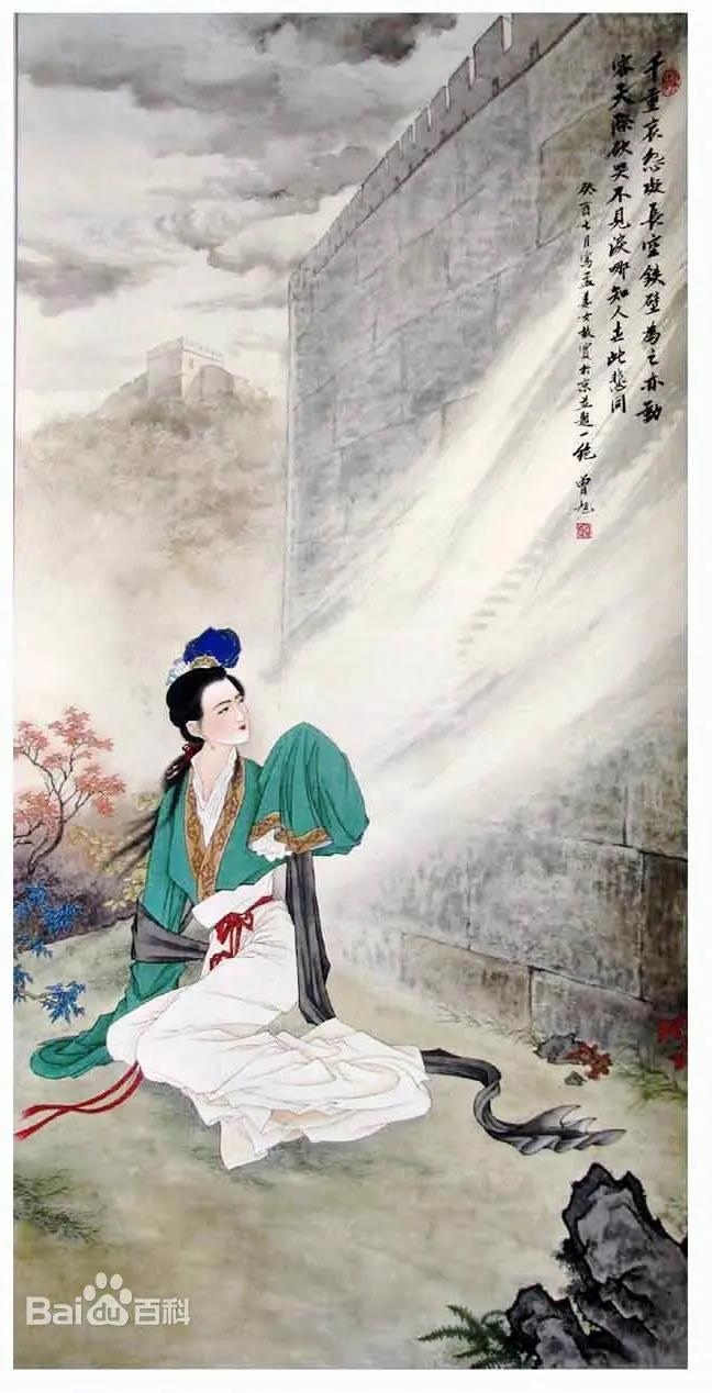 一夜之間,做好棉衣,孟姜女千里迢迢,踏上路程。一路上跋山涉水,風(fēng)餐露宿,不知饑渴,不知勞累,晝夜不停地往前趕,這一日終于來到了長城腳下??砷L城下民夫數(shù)以萬計,到哪里去找呢?她逢人便打聽,好心的民夫告訴她,范喜良早就勞累致死,被埋在長城里筑墻了。孟姜女一聽,心如刀絞,便求好心的民工引路來到了范喜良被埋葬的長城下。坐在城下,孟姜女悲憤交加:想自己千里尋夫送寒衣,盡歷千難萬險,到頭來連丈夫的尸骨都找不到,怎不令人痛斷柔腸。愈想愈悲,便向著長城晝夜痛哭,不飲不食,如啼血杜鵑,望月子規(guī)。這一哭感天動地,白云為之停步,百鳥為之噤聲。直哭了七天七夜,忽聽轟隆隆一陣山響,一時間地動山搖,飛沙走石,長城崩倒了八百里,露出范喜良的尸骨。