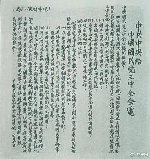 1937年2月10日,中共中央致電國(guó)民黨五屆三中全會(huì),提出五項(xiàng)要求:停止內(nèi)戰(zhàn),一致對(duì)外;保障言論、集會(huì)、結(jié)社的自由,釋放一切政治犯;召開各黨各派各界各軍的代表會(huì)議,集中全國(guó)人才,共同救國(guó);迅速完成對(duì)日作戰(zhàn)的一切準(zhǔn)備工作;改善人民生活。電文指出,如果國(guó)民黨將上述五項(xiàng)要求定為國(guó)策,中國(guó)共產(chǎn)黨愿實(shí)行如下四項(xiàng)保證:停止武力推翻國(guó)民黨政府的方針;工農(nóng)政府改名為中華民國(guó)特區(qū)政府,紅軍改名為國(guó)民革命軍;特區(qū)實(shí)行徹底民主制度;停止沒(méi)收地主土地的政策,堅(jiān)決執(zhí)行抗日統(tǒng)一戰(zhàn)線的共同綱領(lǐng)。15日,在國(guó)民黨的五屆三中全會(huì)上,宋慶齡、何香凝、馮玉祥等為響應(yīng)中國(guó)共產(chǎn)黨關(guān)于國(guó)共合作,聯(lián)合抗日的建議,提出關(guān)于恢復(fù)孫中山所制定的聯(lián)俄、聯(lián)共、扶助農(nóng)工三大政策緊急議案。