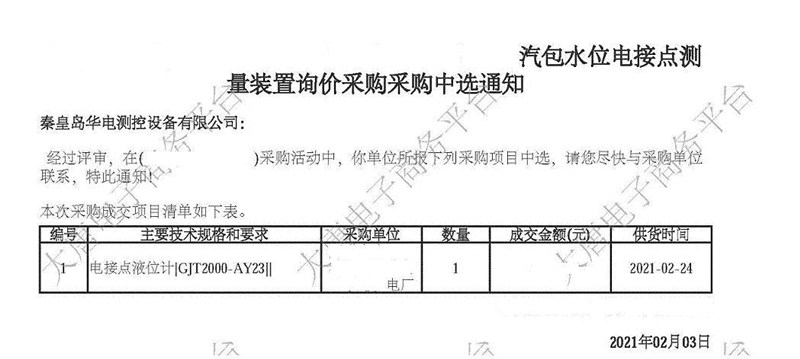 2021年2月3日,我公司在大唐集團(tuán)安徽某電廠的電接點(diǎn)液位計(jì)改造項(xiàng)目的競標(biāo)中,憑借強(qiáng)大的綜合實(shí)力以及過硬的產(chǎn)品質(zhì)量,通過層層篩選、激烈角逐,以絕對的優(yōu)勢順利中標(biāo)。
