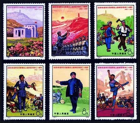 1972年5月23日發(fā)行的編號郵票33-38 紀(jì)念《在延安文藝座談會上的講話》發(fā)表三十周年,共6枚。編號郵票33,面值8分,圖案為“座談會會址”。編號郵票34,面值8分,圖案為“高唱革命歌曲”。編號郵票35,面值8分,圖案為“街頭劇《兄妹開荒》”。編號郵票36,面值8分,圖案為“文藝工作者深入工農(nóng)兵,邊勞動、邊宣傳”。這4枚反映的都是中華人民共和國建國前的情景, 故均以延安寶塔山作為背景。編號郵票37,面值8分,圖案為“為農(nóng)民演出”。編號郵票38,面值8分,圖案為“為工人演出”;這2枚中的人物是現(xiàn)代京劇《紅燈記》中的李玉和與芭蕾舞劇《紅色娘子軍》中的吳瓊花。