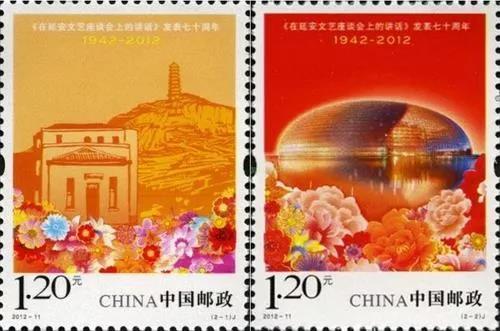 中國郵政于2012年5月23日發(fā)行《<在延安文藝座談會上的講話>發(fā)表七十周年》紀(jì)念郵票1套2枚。票圖名稱分別為“座談會舊址”、“文藝發(fā)展繁榮”,郵票面值均為1.20元。設(shè)計者為郭線廬。郵票發(fā)行同時推出郵票首日封。