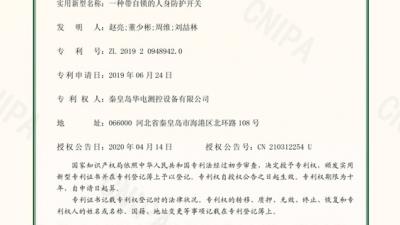 公司于2019年6月24日提交的“一種帶自鎖的人身防護(hù)開關(guān)”(專利號:201920948942.0)專利,由中華人民共和國國家知識產(chǎn)權(quán)局頒發(fā)實(shí)用新型專利證書。此項(xiàng)專利的授權(quán),標(biāo)志著公司已經(jīng)擁有49項(xiàng)自主知識產(chǎn)權(quán)。一種帶自鎖的人身防More