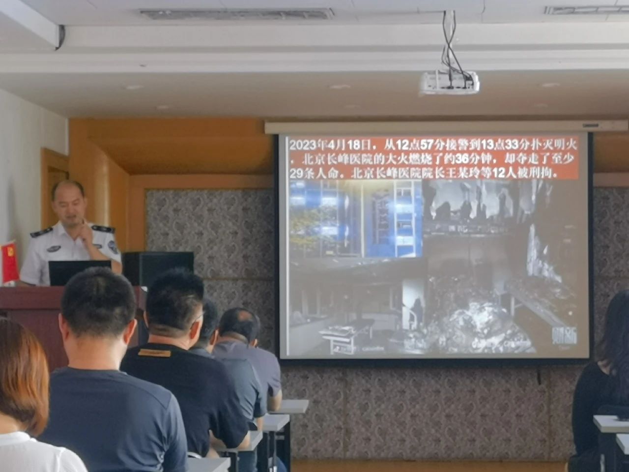 宣講會上,周教官為大家普及了消防知識,通過“北京某醫(yī)院大火”、“央視大樓火災”等火災現(xiàn)場圖片令在座所有人深刻認識到火災的無情與可怕。周教官結合工作和生活實際,從如何預防電氣火災、如何自救與逃生、如何正確使用消防器材等方面均做了深入淺出的講授,并特別提醒全體員工要始終保持安全意識,堅決克服盲目樂觀,杜絕松懈麻痹,真切落實各項防范措施,確保人身與財產(chǎn)安全。