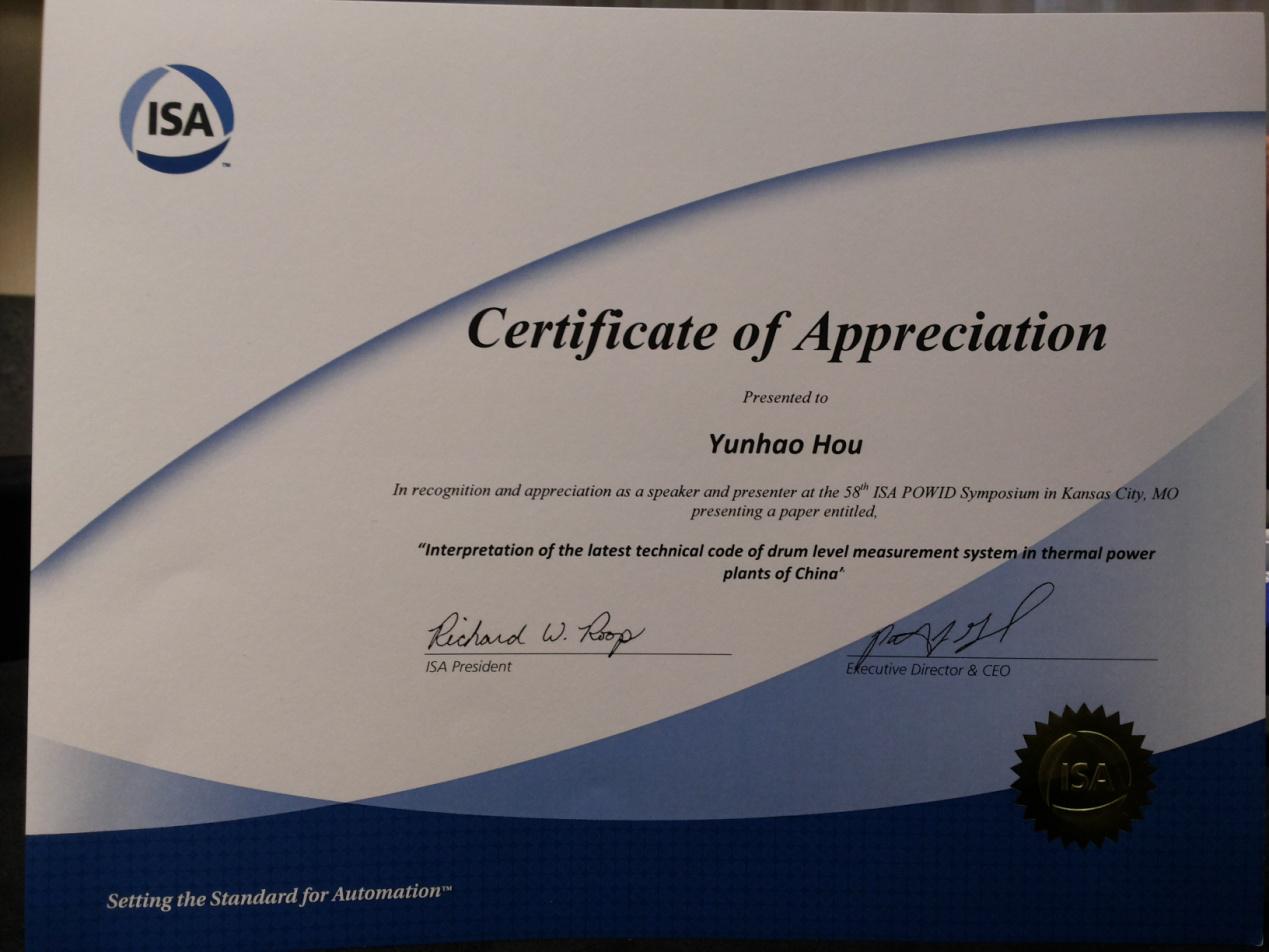 這次是我公司第三次受邀參會(huì),國(guó)貿(mào)部副經(jīng)理、高級(jí)工程師于勝利和副總工程師崔明思代表公司參會(huì)。新的汽包水位測(cè)量技術(shù)行業(yè)標(biāo)準(zhǔn)得到了與會(huì)專(zhuān)家的高度重視和認(rèn)可,公司在汽包水位測(cè)量技術(shù)領(lǐng)域取得的成就得到了美國(guó)標(biāo)準(zhǔn)管理局ISA和電力行業(yè)專(zhuān)家的肯定和贊譽(yù)。華電測(cè)控對(duì)世界電力行業(yè)做出了突出的貢獻(xiàn),在標(biāo)準(zhǔn)層面引領(lǐng)世界電力行業(yè)向更安全,更可靠發(fā)展。